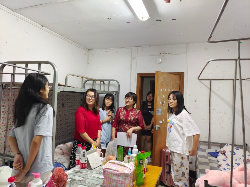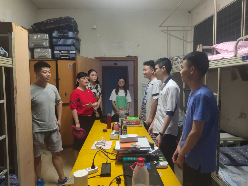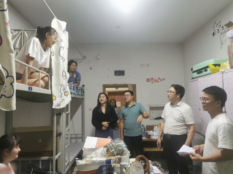 9月8日20:30,学院党总支书记刘明明、副院长胡守敏、副院长张莉以及部分总支委员和学工人员走访我院2021级新生宿舍。