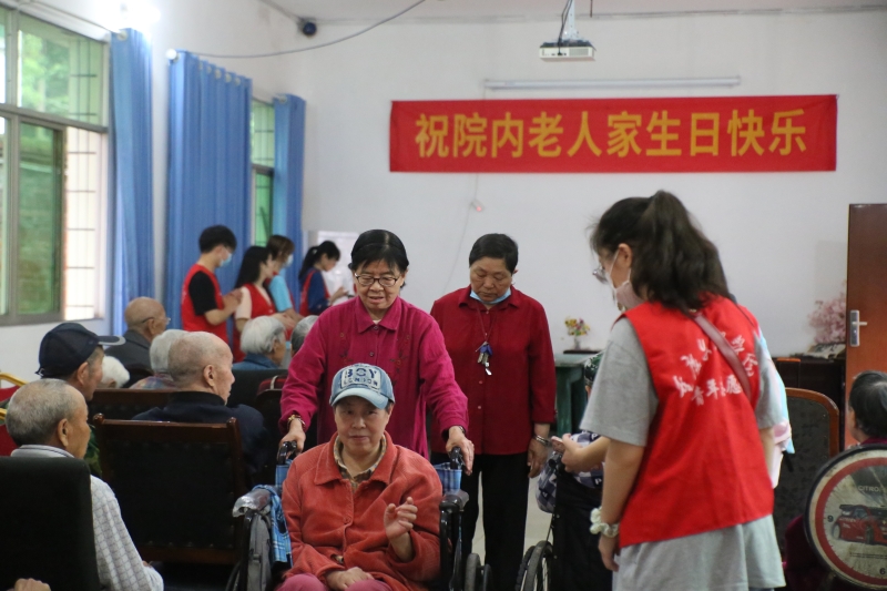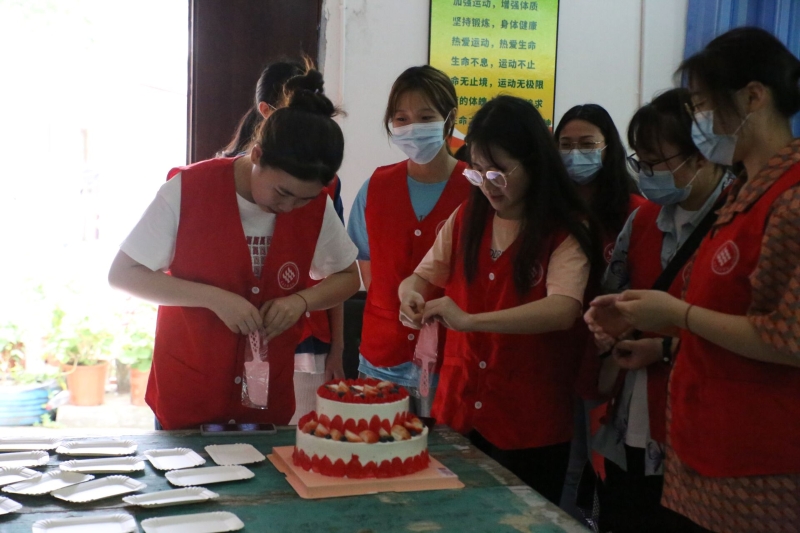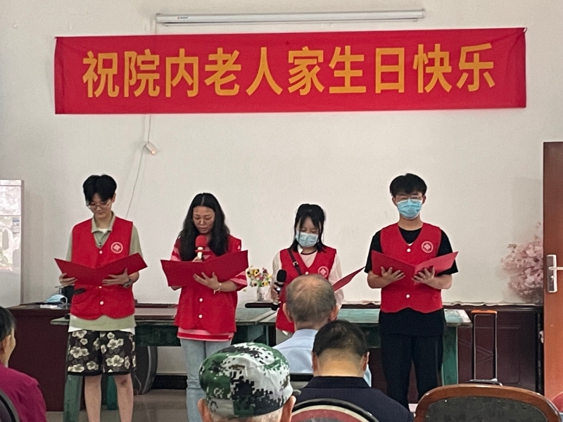 上午八点四十分,志愿者们乘公交到达星怡养老院。按照分组,一部分志愿者去陪伴老人聊天,一部分帮助老人整理房间、布置活动场地等。随后,各位志愿者们搀扶老人们到达活动室,志愿者们齐唱《我和我的祖国》,用饱满的热情带动现场的活动氛围。创业实践部的樊希、唐新明、熊萌萌、杨任红为老人带来了饱含深情的诗朗诵《我爱祖国》。谭媛芫同学绘声绘色地为他们讲述了袁隆平院士的故事,赞扬了老一辈人质朴、淡泊名利的美好品质。恰逢敬老院老人们生日,全体志愿者们也用精心挑选的蛋糕,为院内老人们一起庆祝了生日。各位老人纷纷唱起了红歌,赞颂伟大富强的祖国。最后,全体志愿者和院内老人一起在庭院内进行合照。