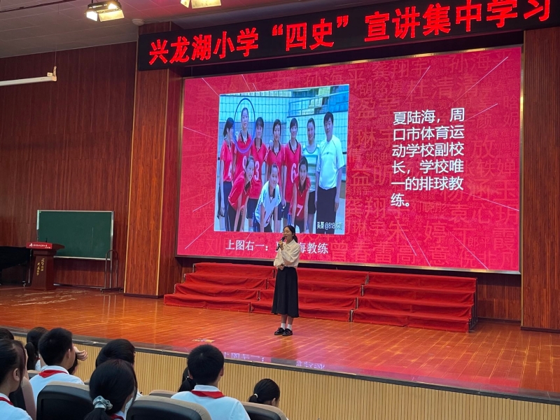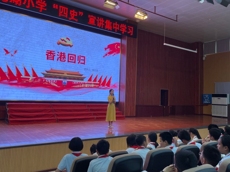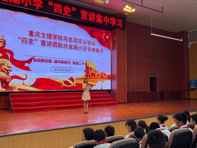 为推动以“党史”为主线的“四史”学习教育持续深入开展,2022年6月8日9:30,我院“四史”学习教育宣讲团10名成员在刘明明书记和张善英老师的带领下赴永川区兴龙湖小学开展以“奋进新征程、建功新时代、喜迎二十大”为主题的专场宣讲。兴龙湖小学党总支书记、校长陈小渝,党总支副书记陈勇、副校长王农川以及全体六年级的老师和学生共计800余人参与观看。