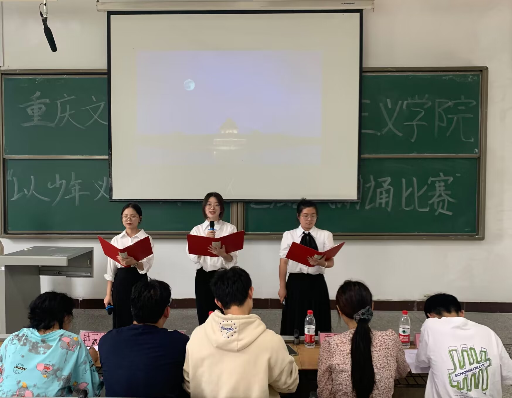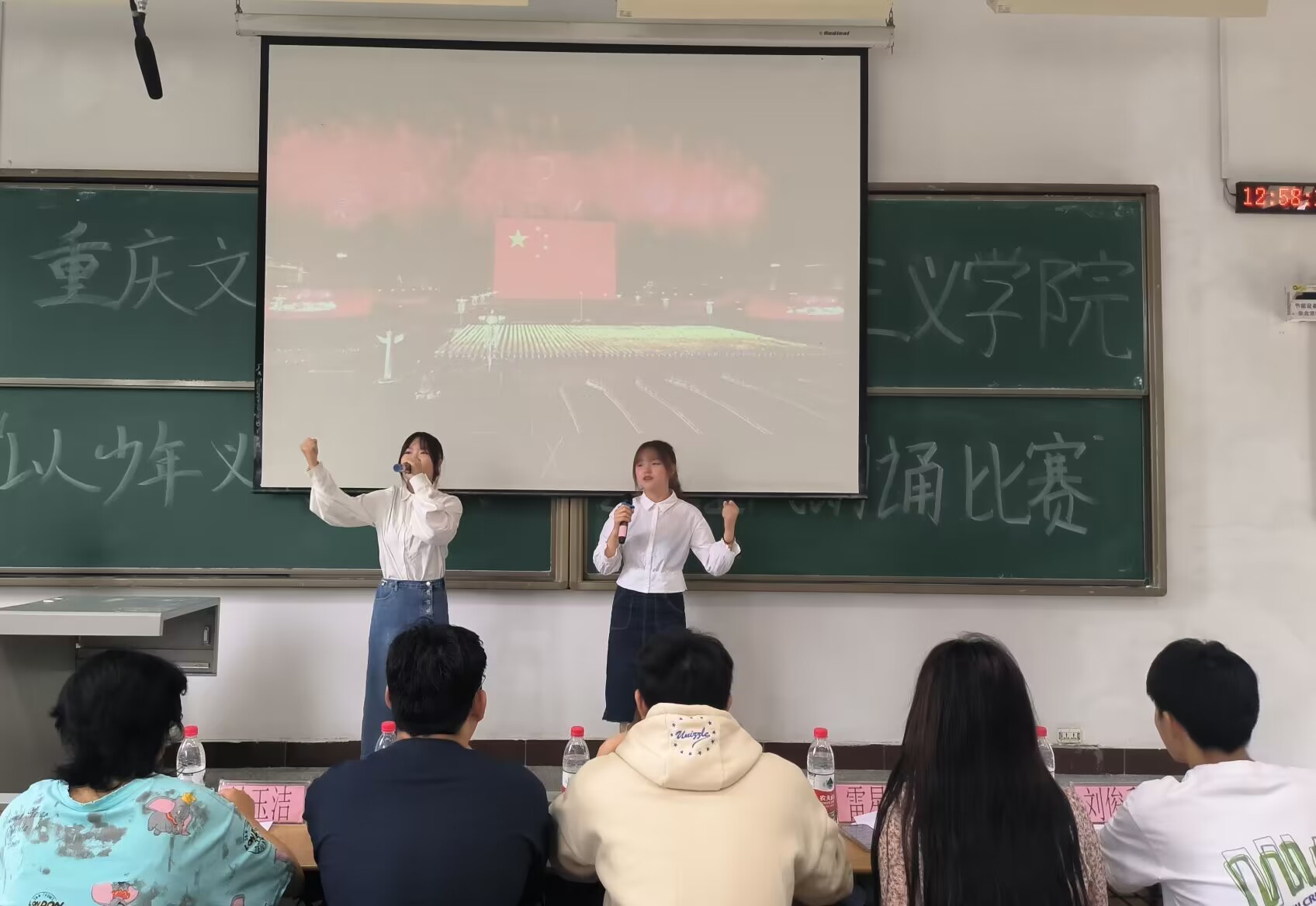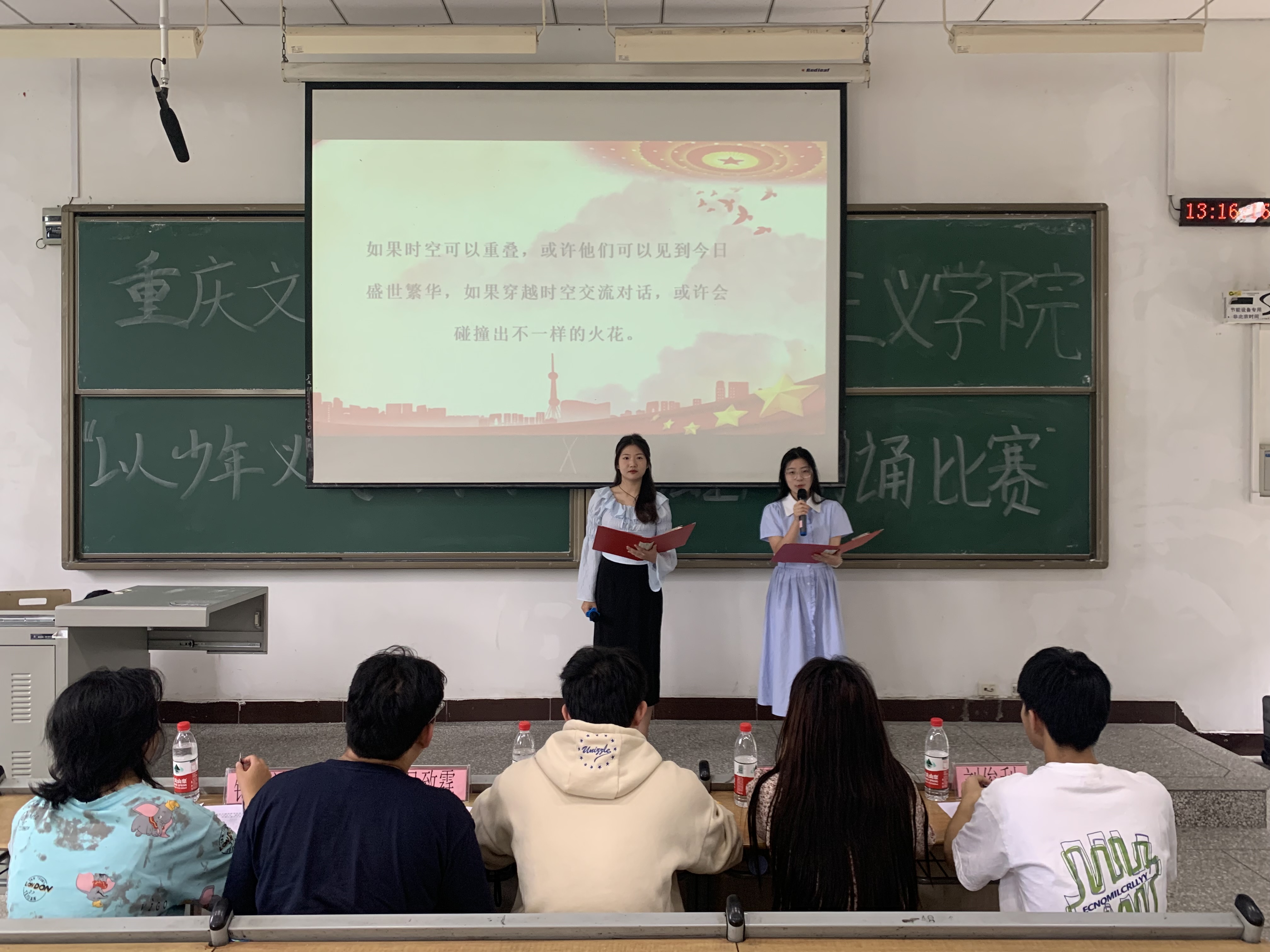 学院12组同学通过视频、PPT与音乐、舞蹈等相结合的方式,声情并茂地呈现了《我爱你,中国》《永远跟党走》《这盛世如您所愿》《月光下的中国》等作品,歌颂了中国共产党领导下的盛世中华,表达了学子们的深深爱国之情,让人深感震撼,备受鼓舞。王怡波结合评分标准,从选题、内容、展现形式、表演技巧等方面进行了点评。