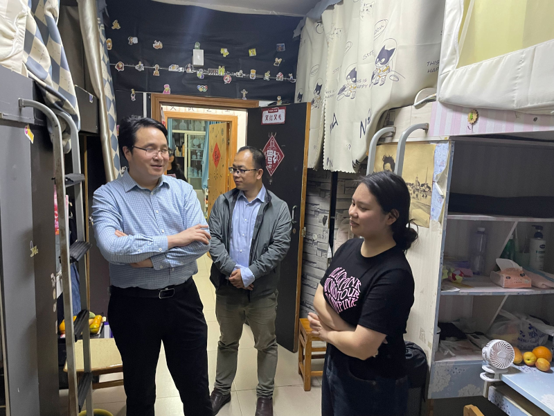 为推动主题教育走深走实,贯彻落实学生社区治理有关文件和会议精神,充分了解学生思想、学习和生活情况,近日,Betway必威西汉姆联官方网站院长胡守敏、党总支书记杨正强、副院长李景国、副院长张莉带领各科室负责人、辅导员、部分学生干部多次深入学生宿舍开展走访调研。