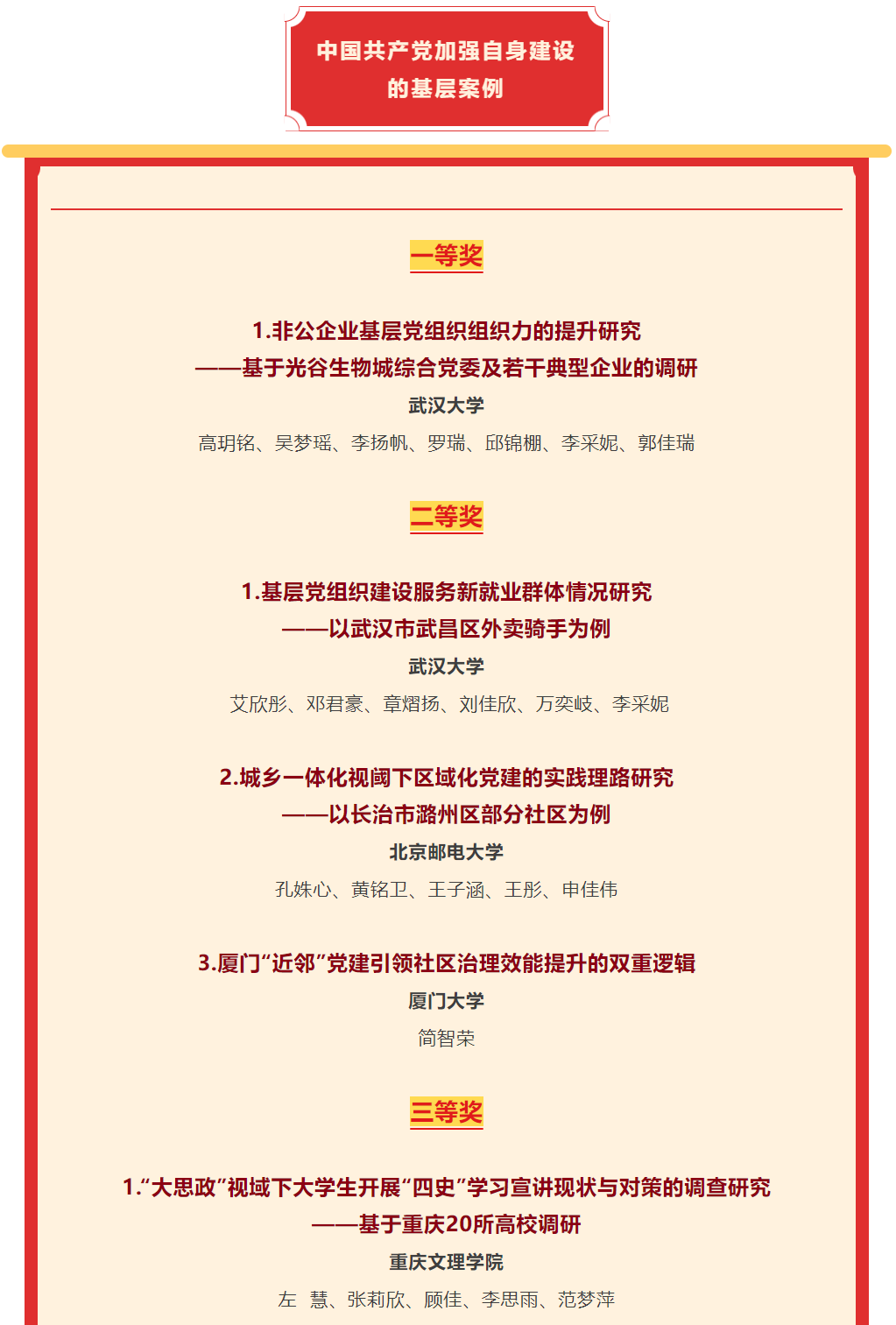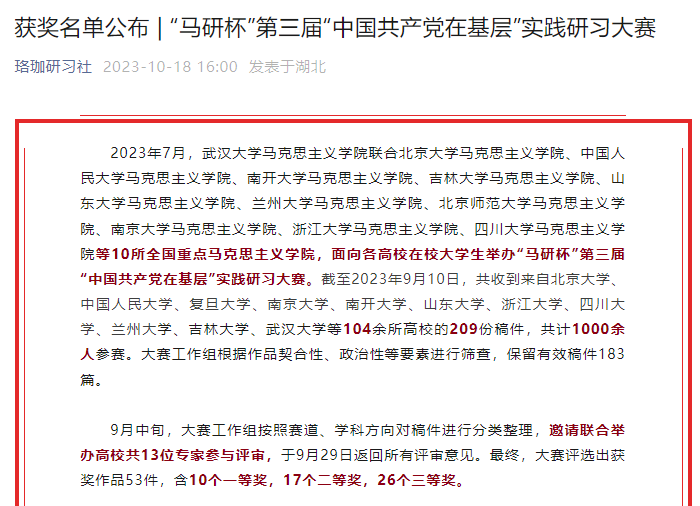 本届大赛由武汉大学Betway必威西汉姆联官方网站联合10所全国重点Betway必威西汉姆联官方网站主办,面向全国各高校在校大学生征集作品,共收到来自北京大学、中国人民大学、复旦大学、南京大学、南开大学、浙江大学、兰州大学、吉林大学等104余所高校作品。本次比赛分为四个主题,参赛选手共计1000余人,获奖作品仅53件,含10个一等奖、17个二等奖、26个三等奖。我院作品在“中国共产党加强自身建设的基层案例”主题中排名第五。