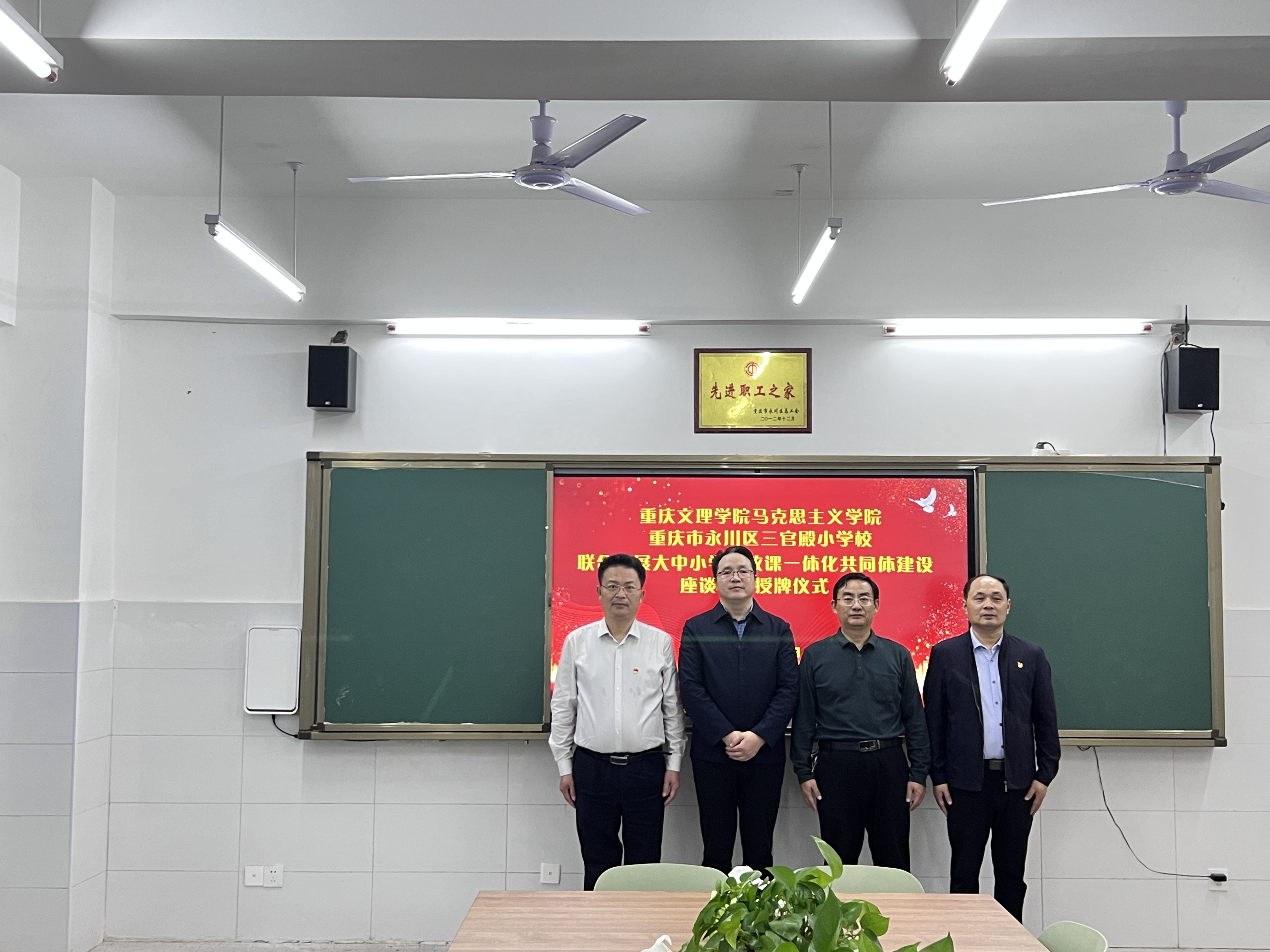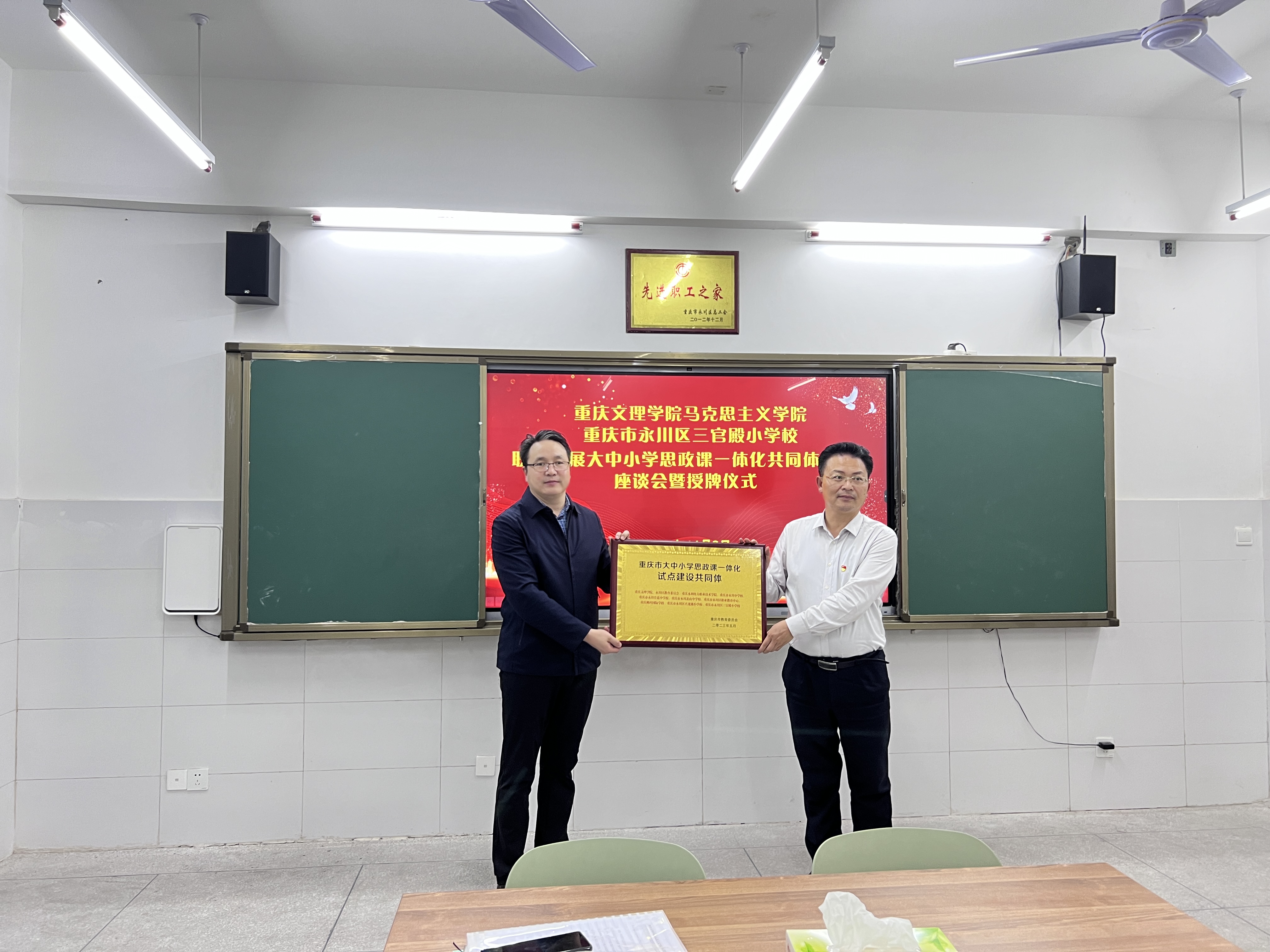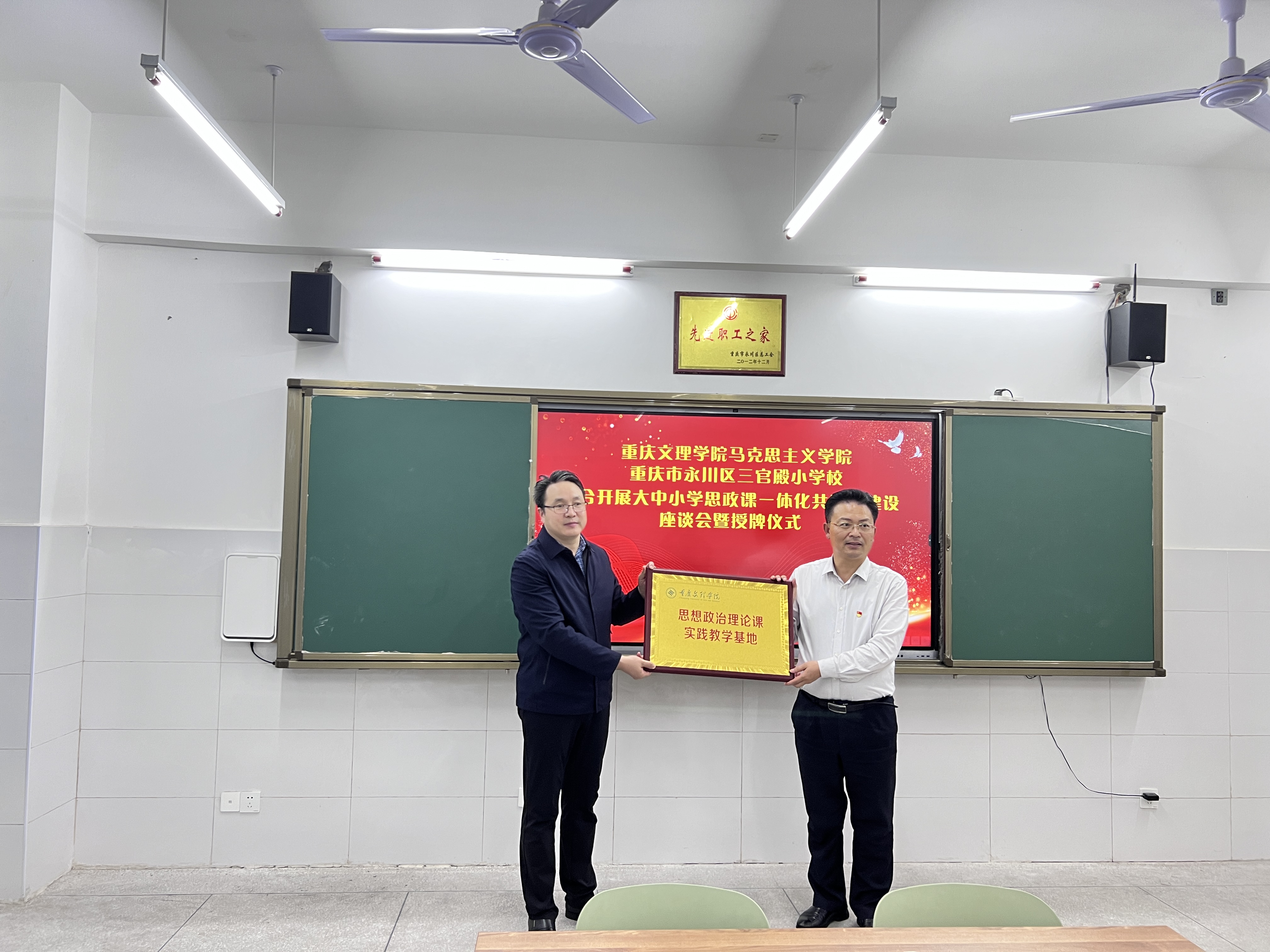 为统筹推进大中小学思政课一体化建设,提高思想政治理论育人实效,11月3日,Betway必威西汉姆联官方网站与永川区三官殿小学校举行了大中小学思政课一体化建设座谈会暨授牌仪式。学院院长胡守敏、副院长李景国、学院相关科室同志,三官殿小学校校长王成祥、党支部副书记宋涛、部分教师代表参加了会议。宋涛主持会议。