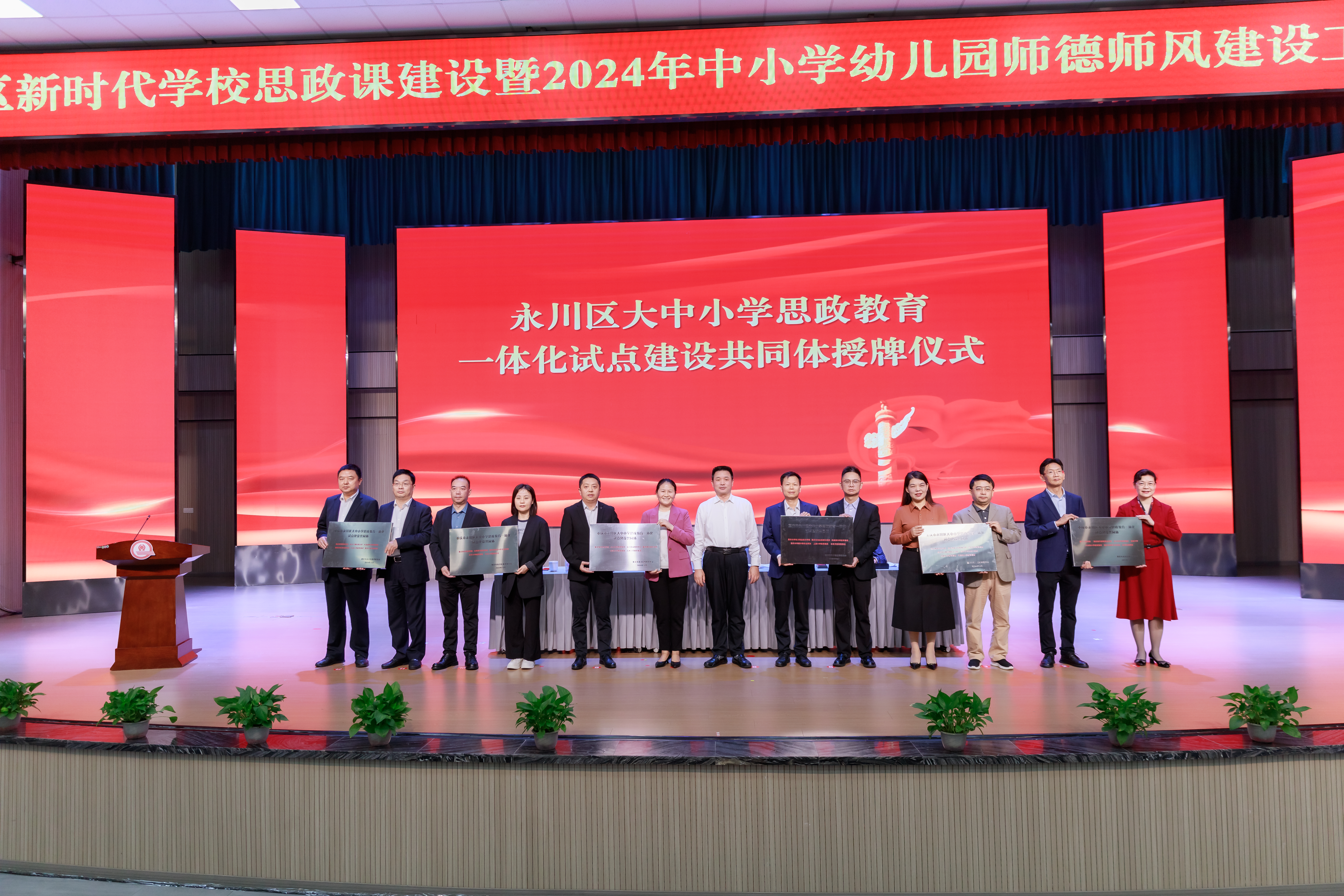 蔡焘为永川区大中小学思政教育一体化试点建设共同体单位进行授牌。我校、永川中学教育集团等大中小幼学校接受了授牌。