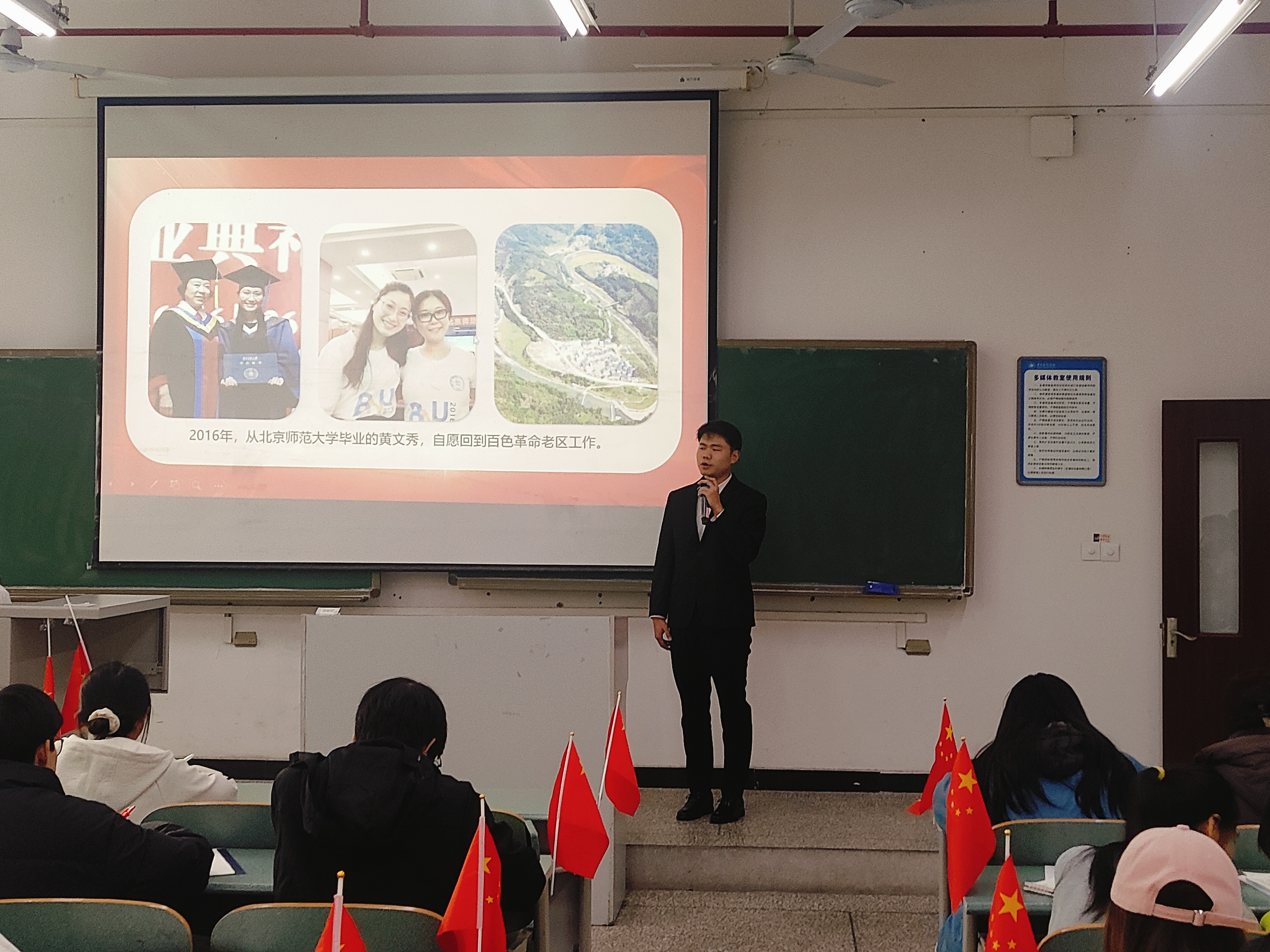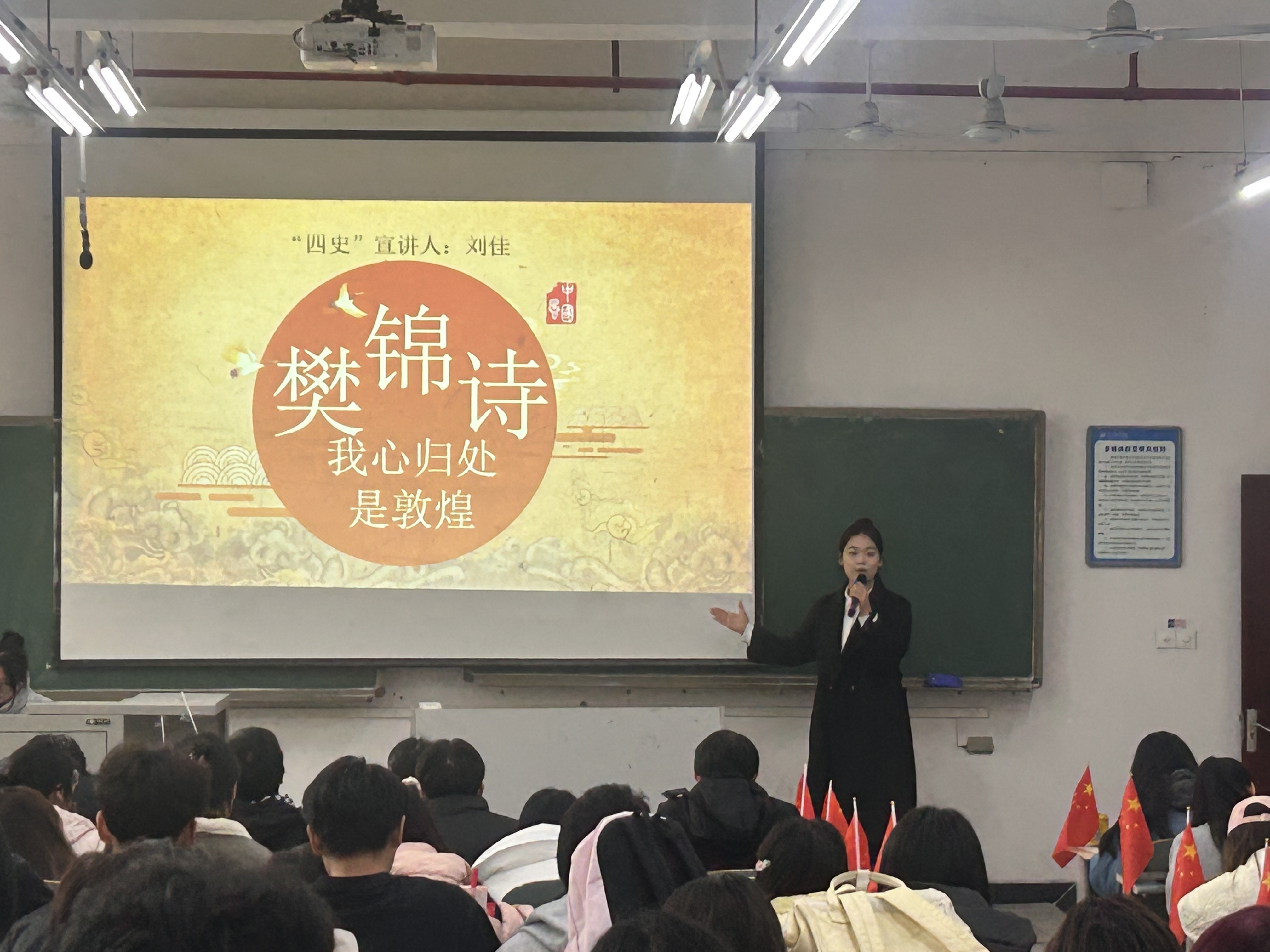 本次宣讲由宣讲团成员王丹主持,成员李红晴、刘佳、刘鉴锋、祖克会、赵芮、周心琳、张馨月先后上台为同学们讲述了《五四运动》《樊锦诗:我心归处是敦煌》《大山的女儿—黄文秀》等党史故事。宣讲团成员以用感人的事迹、真挚的情感、铿锵的话语展现了中国共产党人的崇高品格和时代楷模的优良风范,引发了同学们的强烈共鸣。
