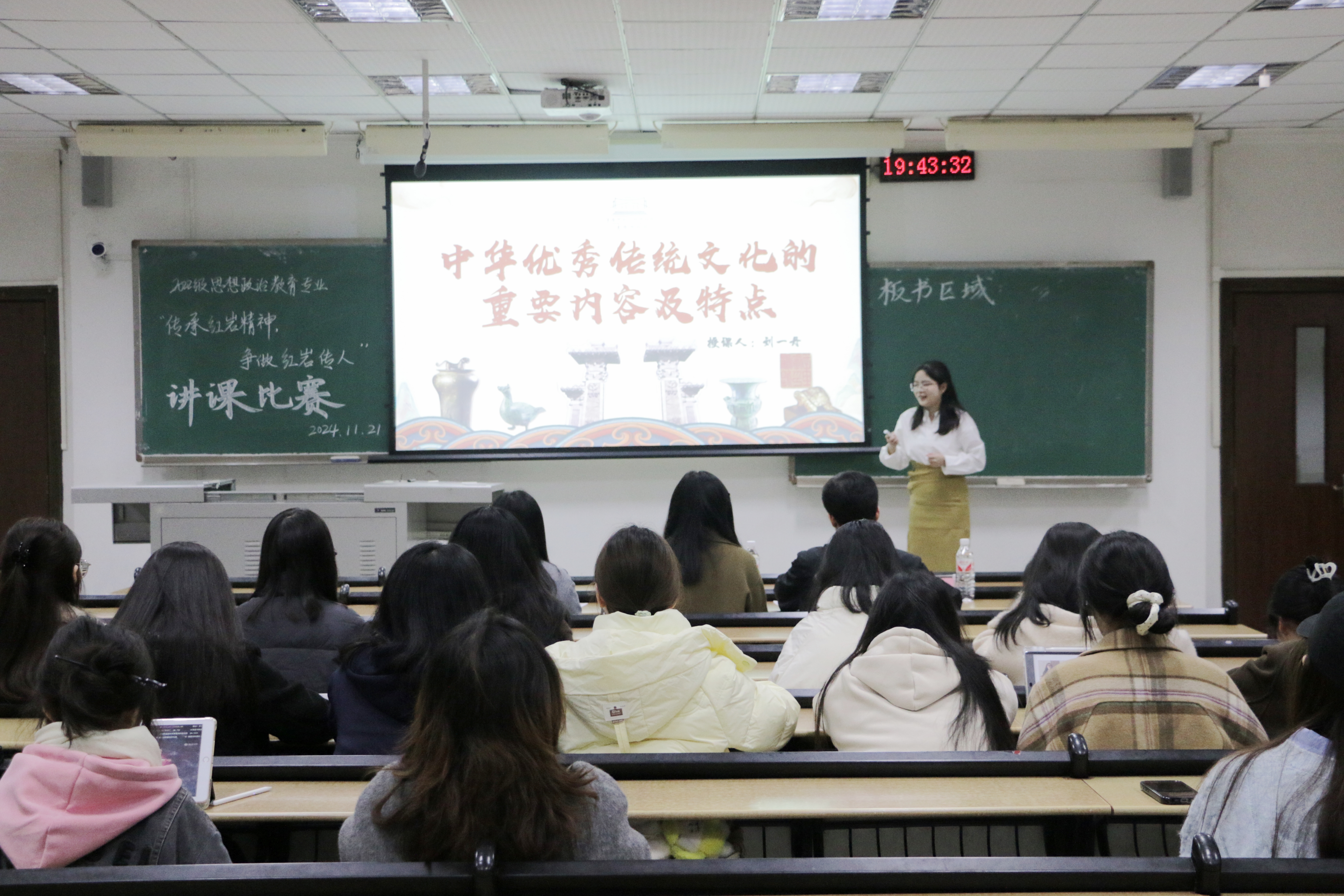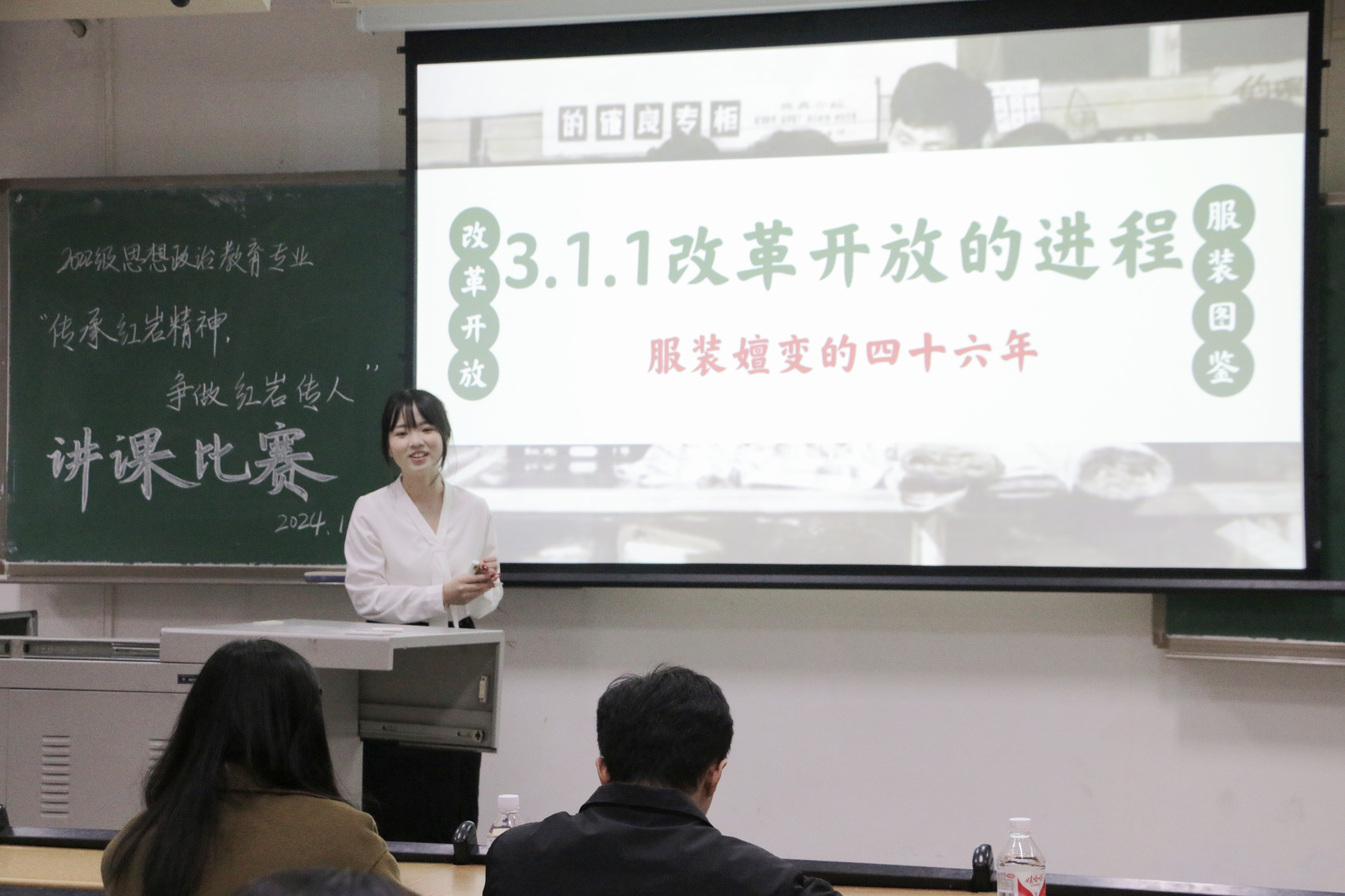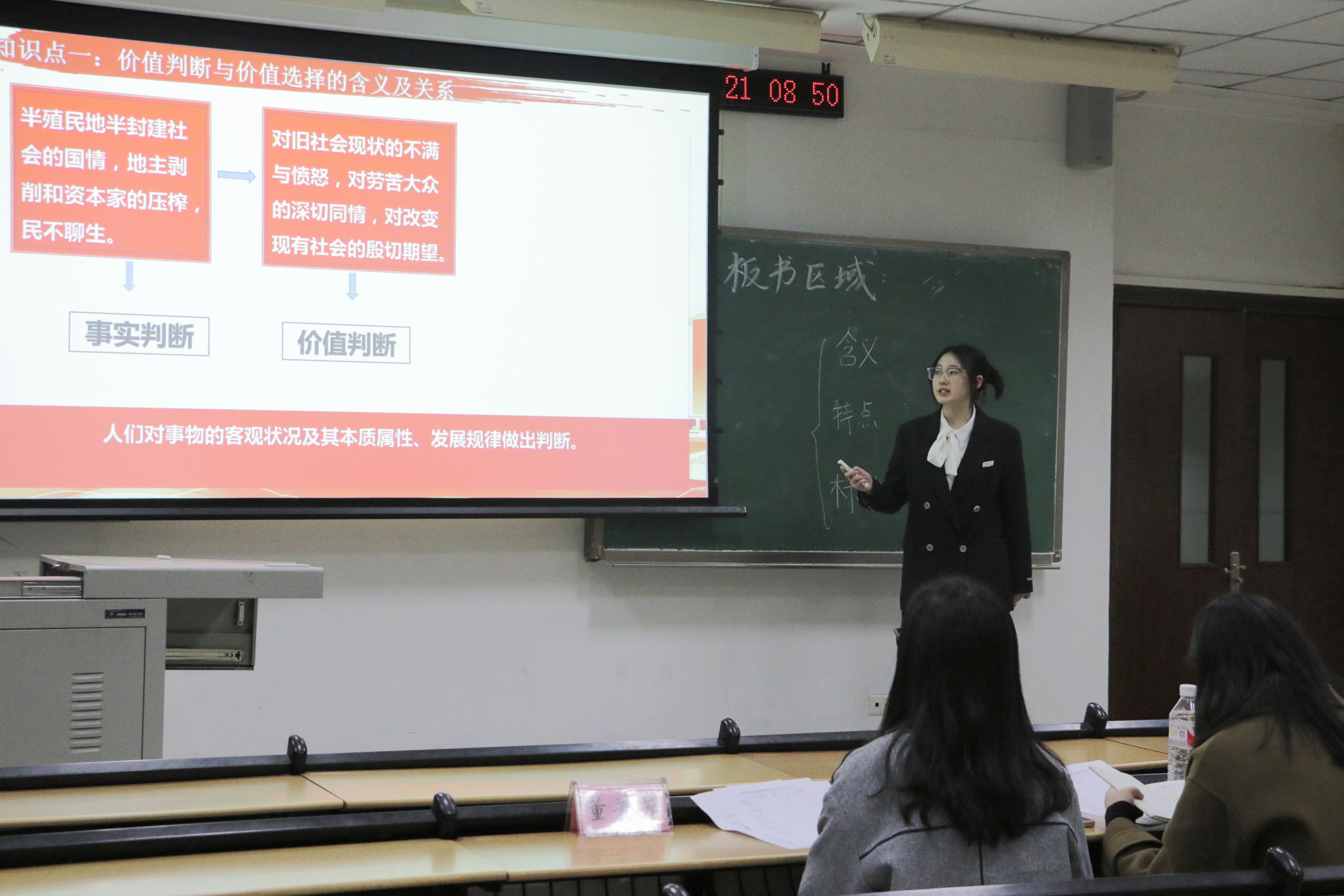 本次比赛以学生个人为单位报名参赛,要求选择初、高中阶段思政课教材某一章节或某一目内容进行课件制作并进行展示汇报,既加强了2022级学生对初高中教材的理解和对讲课流程的熟悉,又锻炼了学生在短时间内制作多媒体课件的能力。比赛分为初赛与决赛两个阶段。在11月中旬抽签分为4组举行了初赛,选拔出13名同学进入决赛。