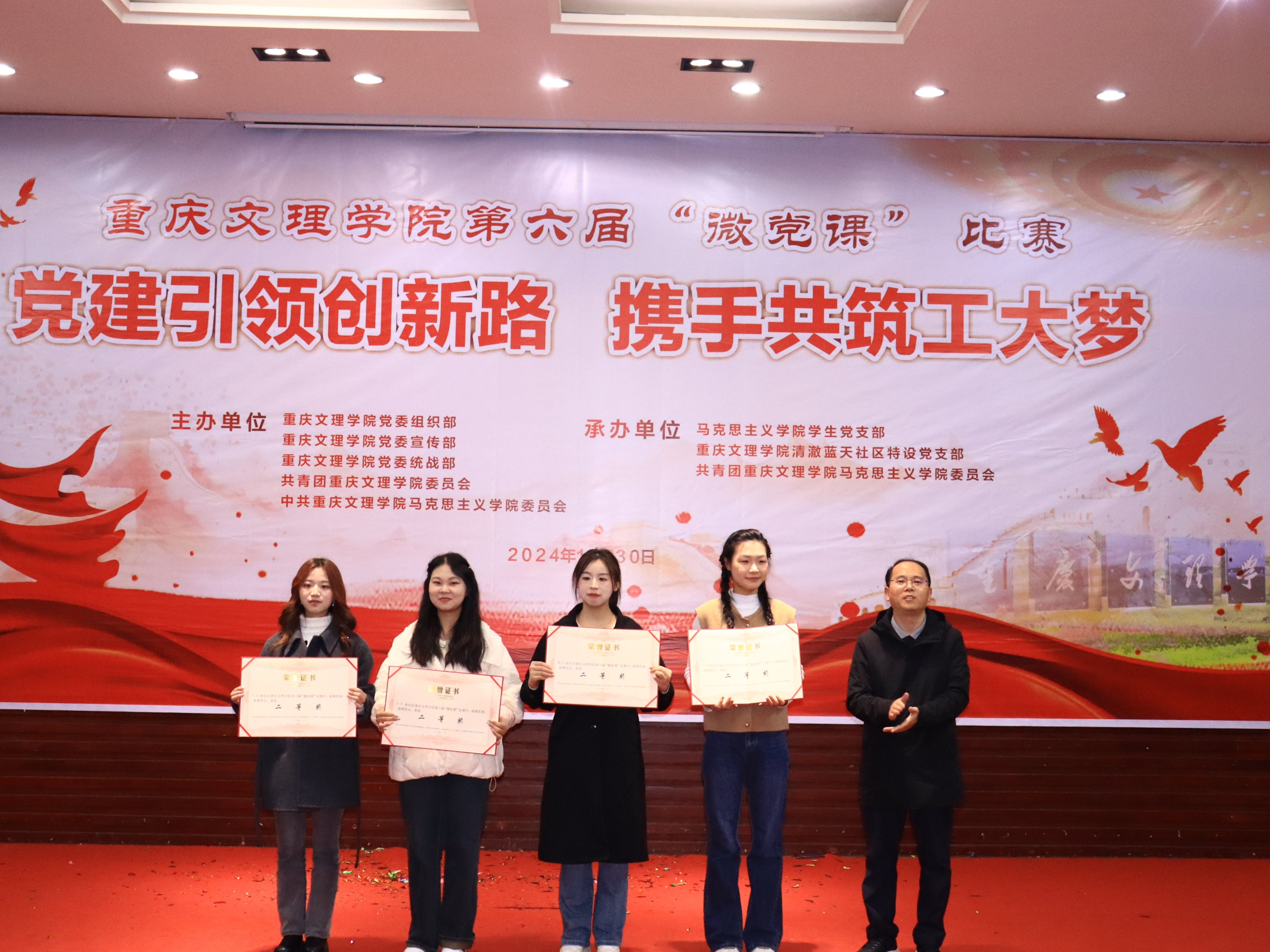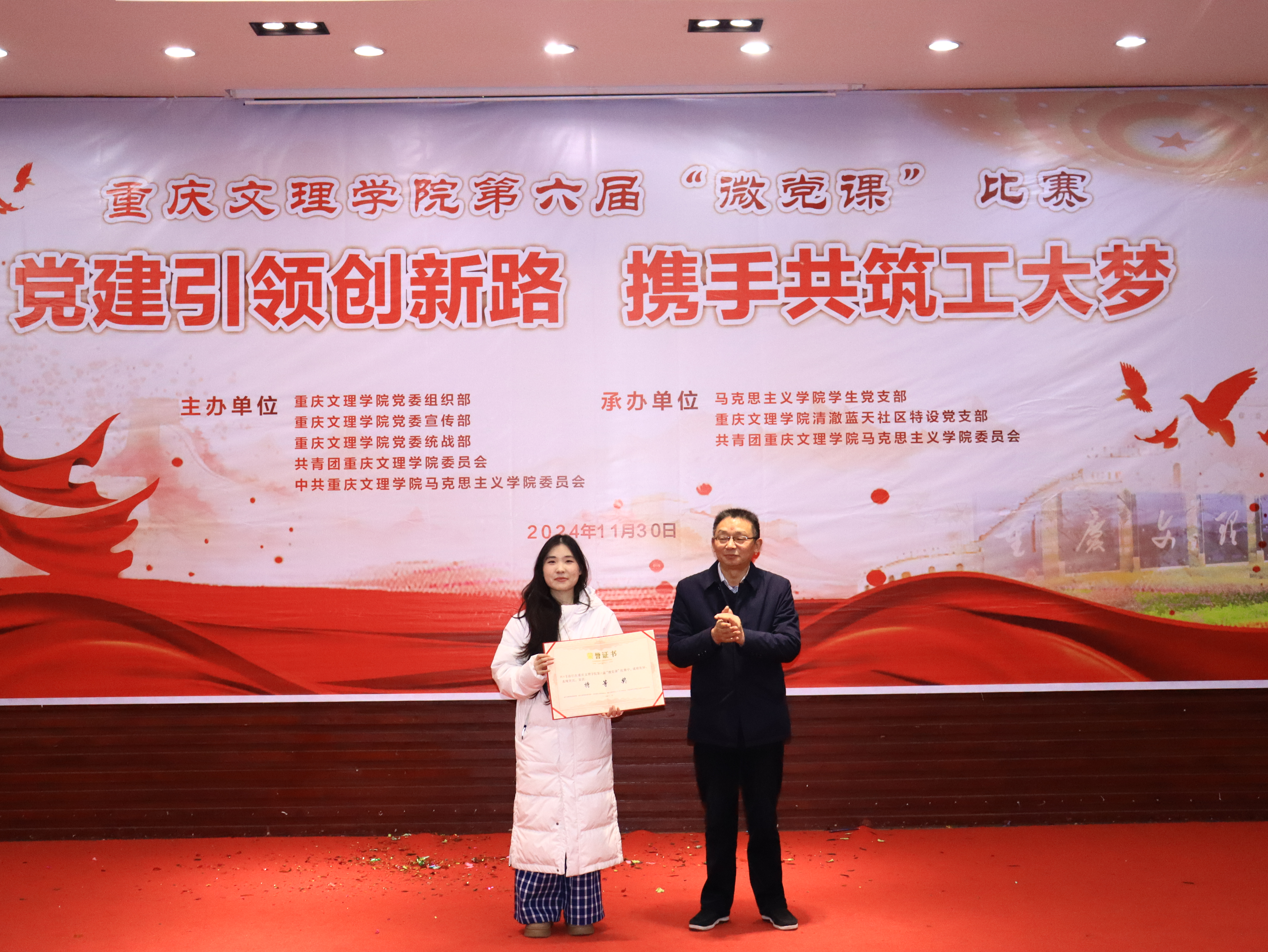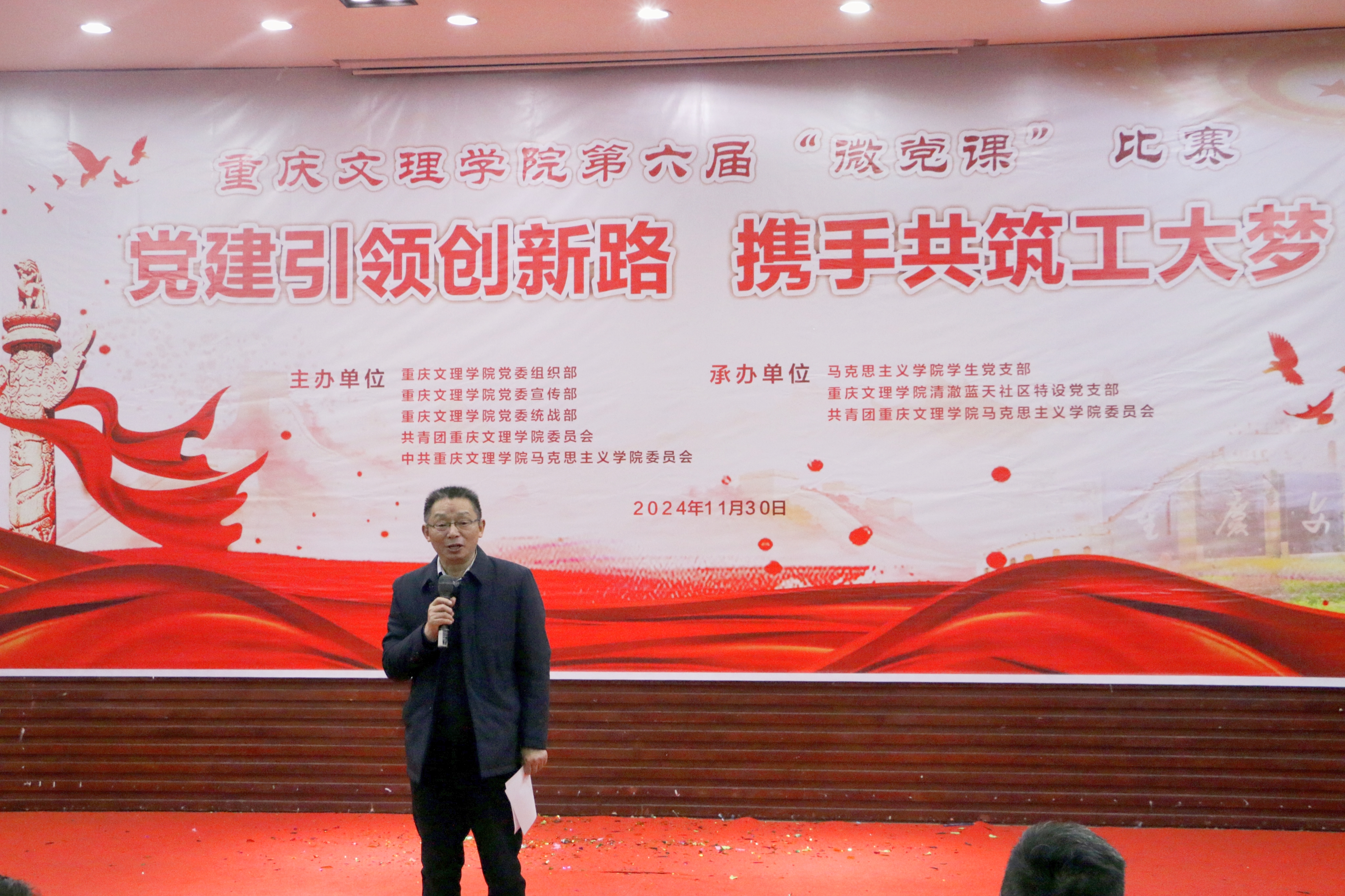 11月30日晚,由重庆文理学院党委组织部、党委宣传部、党委统战部、校团委、Betway必威西汉姆联官方网站党委主办,Betway必威西汉姆联官方网站学生党支部、清澈蓝天社区特设党支部、Betway必威西汉姆联官方网站团委承办的第六届“微党课”比赛总决赛在博文馆101报告厅举行。学校党委组织部、党委宣传部、党委统战部 、校工会、校团委等部门相关负责人参加活动,并担任总决赛评委。Betway必威西汉姆联官方网站党政负责人,各相关二级学院负责人、师生代表共计200余人观摩了比赛。