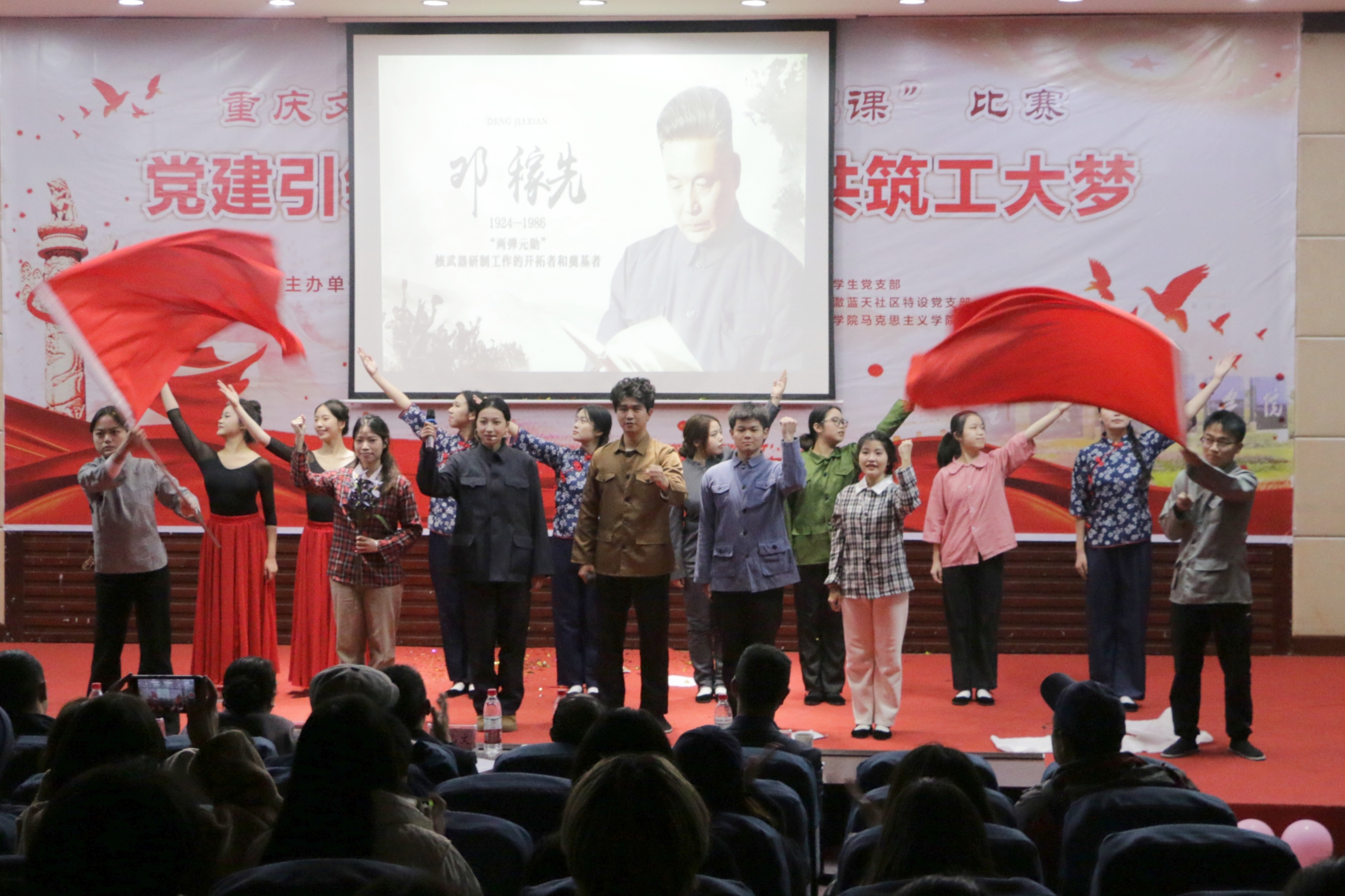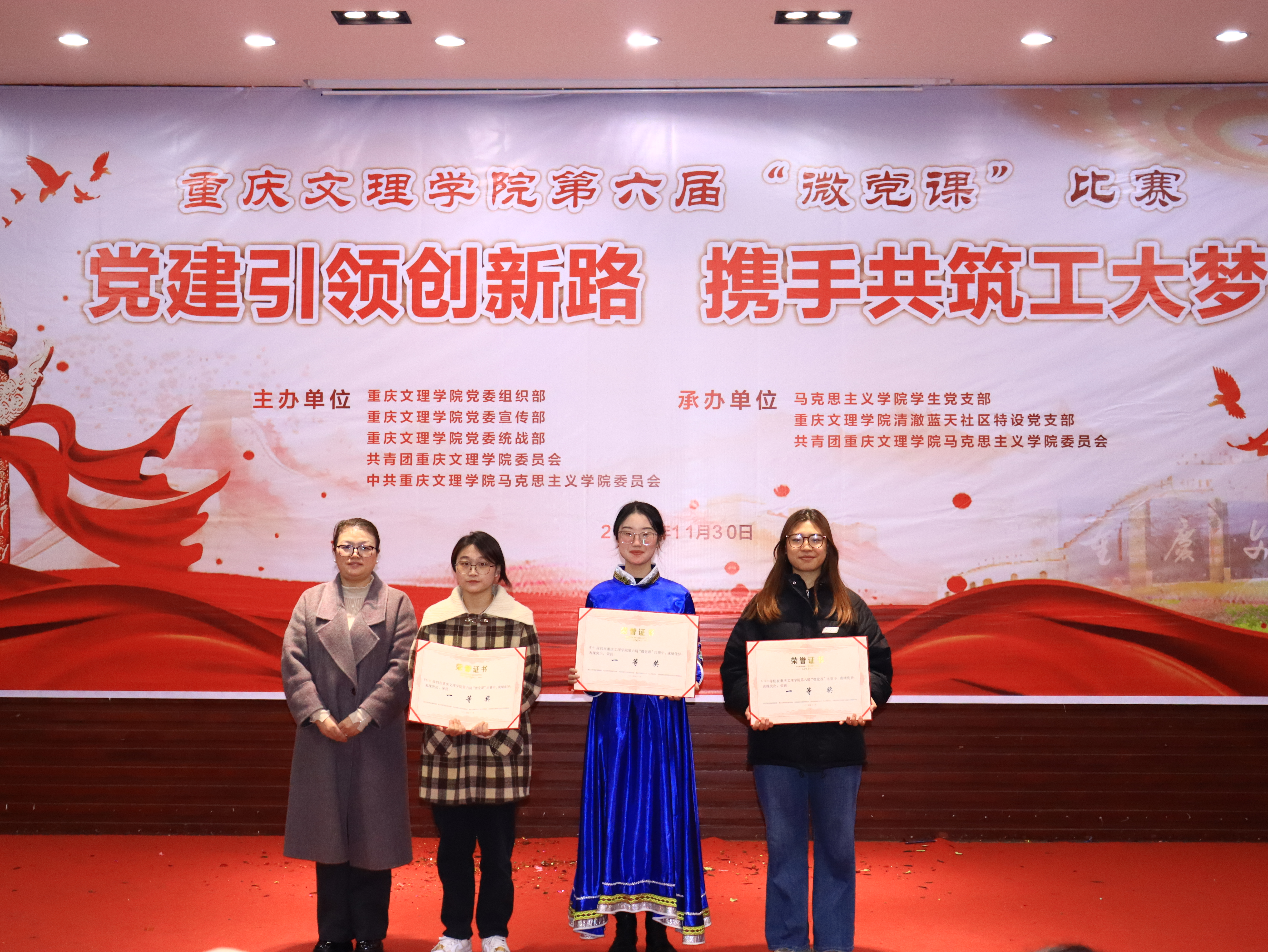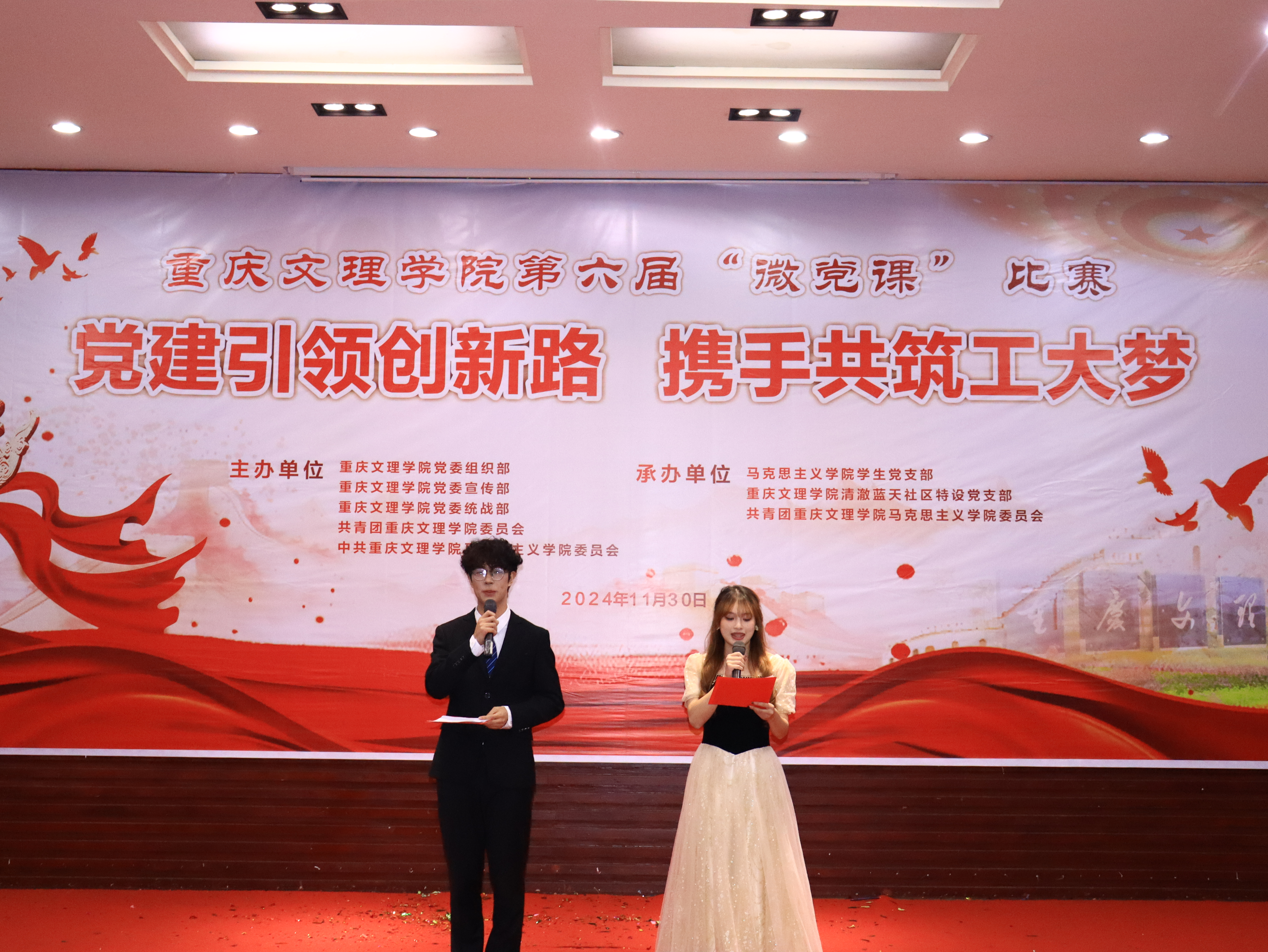 11月30日晚,由重庆文理学院党委组织部、党委宣传部、党委统战部、校团委、Betway必威西汉姆联官方网站党委主办,Betway必威西汉姆联官方网站学生党支部、清澈蓝天社区特设党支部、Betway必威西汉姆联官方网站团委承办的第六届“微党课”比赛总决赛在博文馆101报告厅举行。学校党委组织部、党委宣传部、党委统战部 、校工会、校团委等部门相关负责人参加活动,并担任总决赛评委。Betway必威西汉姆联官方网站党政负责人,各相关二级学院负责人、师生代表共计200余人观摩了比赛。