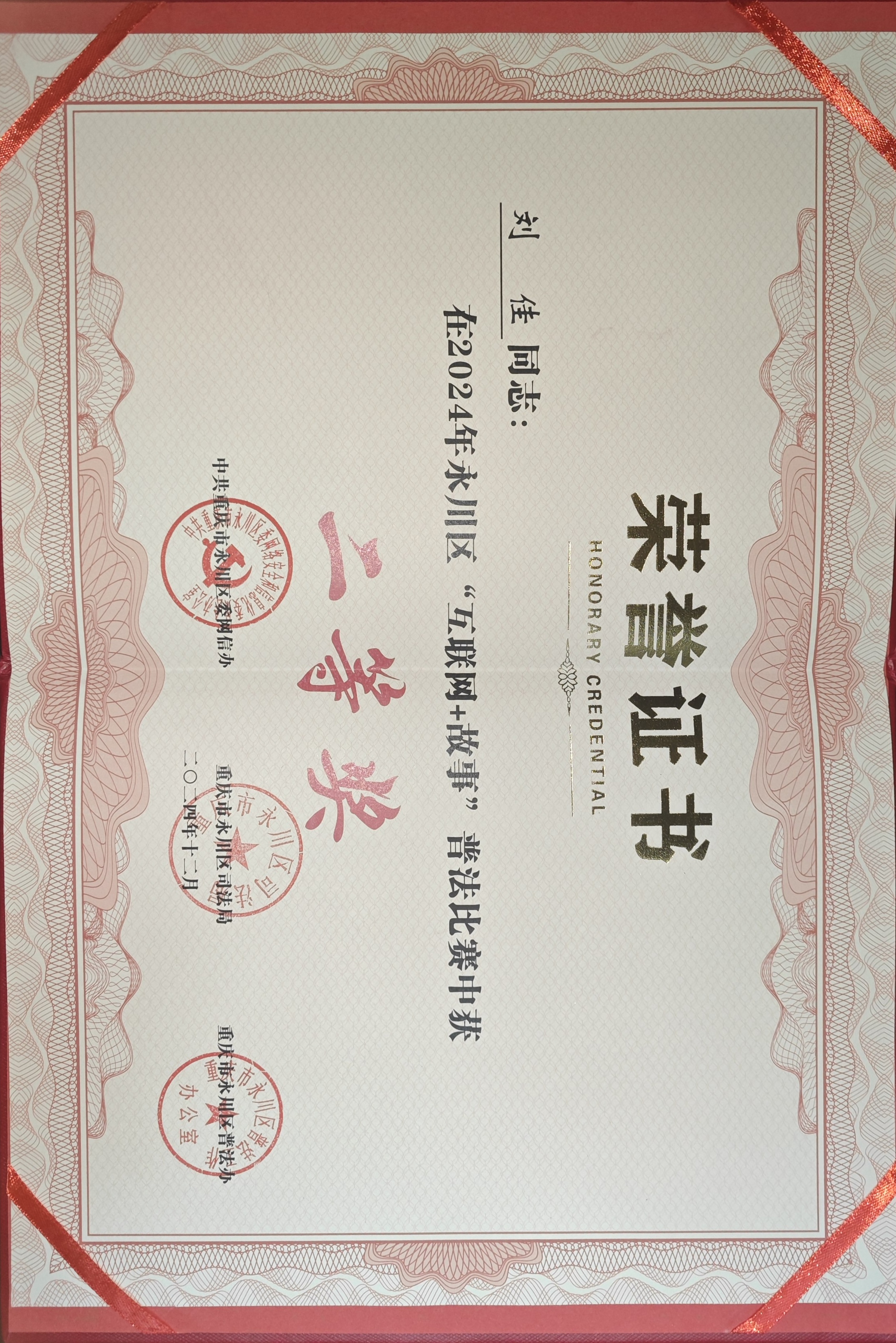 12月12日,中共重庆市永川区委宣传部、中共重庆市永川区委网信办、重庆市永川区司法局组织开展了“互联网+普法”故事展演暨2024年网络文明建设推进活动,重庆文理学院Betway必威西汉姆联官方网站教师李华夏获2024年永川区网络文明建设优秀个人,指导学生刘佳的参赛作品《见义勇为,“建议”勇为》荣获二等奖。