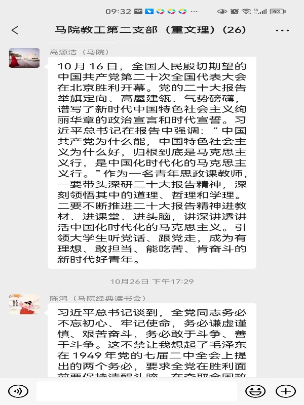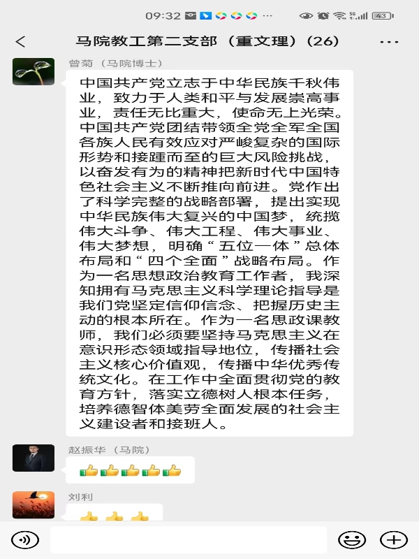 学习结束后,教工一支部的张苏强、赵斌、米梓嘉、孔凡霞、孙淋和教工二支部的赵振华、冉平海、曾菊、高源洁、陈鸿等同志结合自身工作实际就线上和线下学习交流了学习心得,他们纷纷表示通过学习党的二十大报告感悟深刻,作为政治课教师,继续学习党的二十大报告,进一步深刻领悟“两个确立”的决定性意义,增强“四个意识”,坚定“四个自信”,做到“两个维护”,全面贯彻习近平新时代中国特色社会主义思想,牢固坚持党对教育工作的绝对领导,忠诚履行新时代思政课教师的职责使命,更好地实现“立德树人”这一新时代教育的根本任务,为祖国的发展贡献自己的力量。